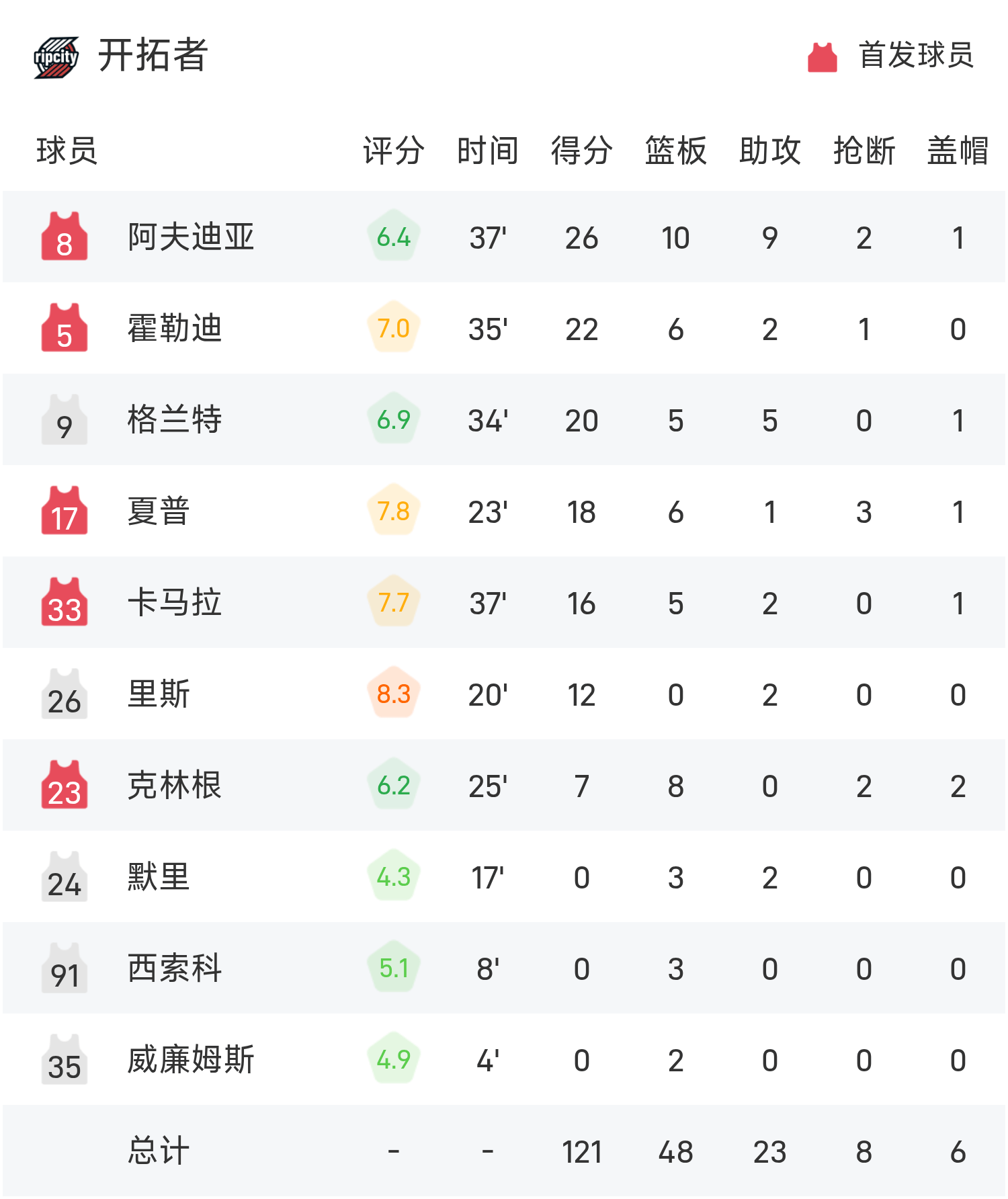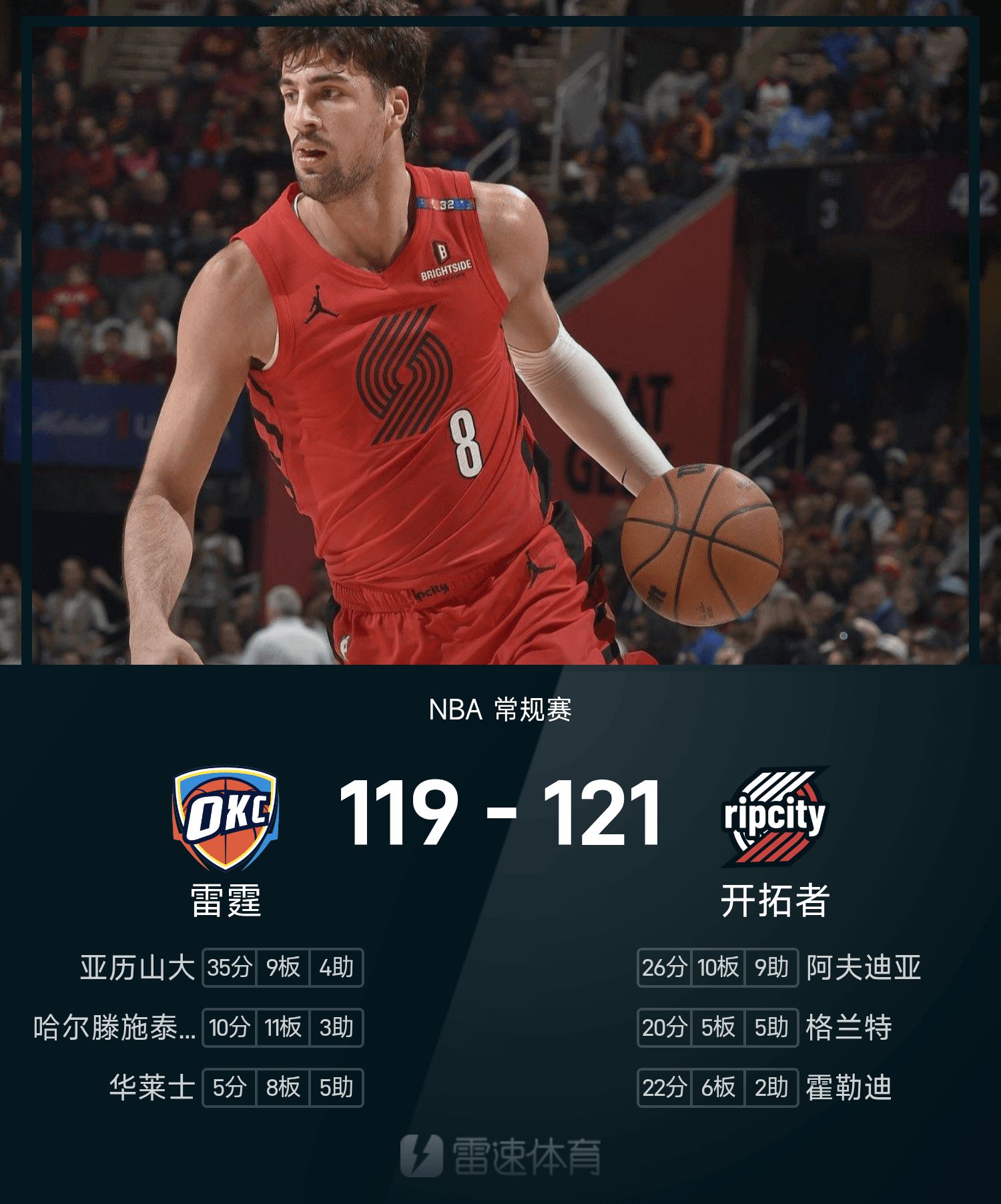 NBA战报:阿夫迪亚26分,杨瀚森未登场,开拓者121-119雷霆