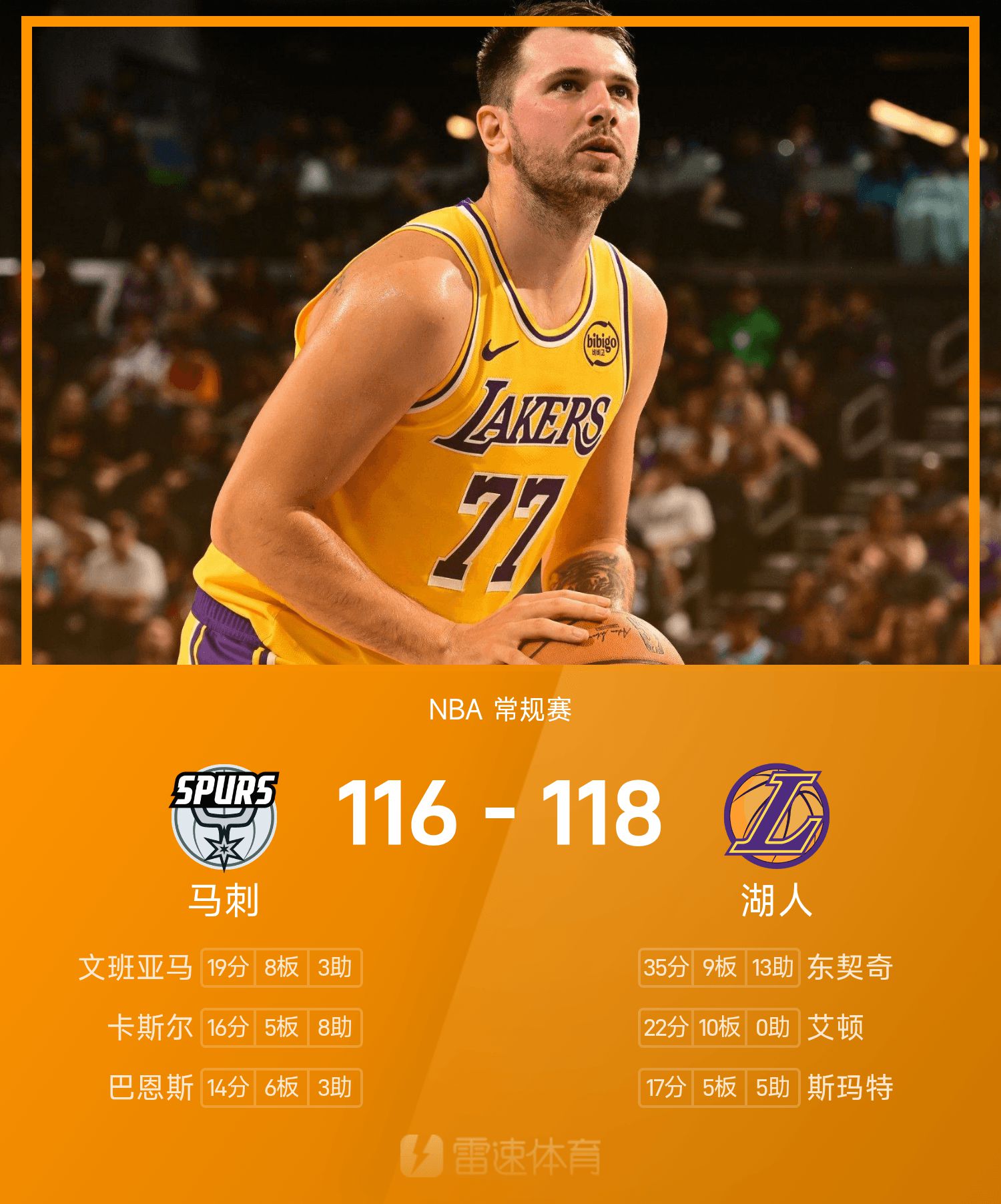 东契奇35分9抢篮板13助攻带领湖人拿下5连胜。