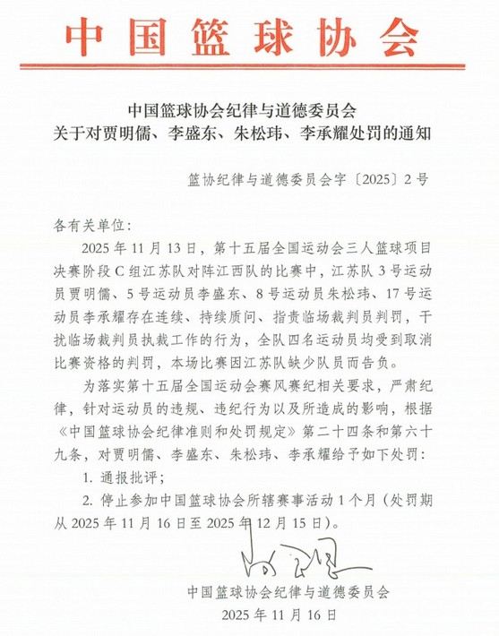 6686体育官网11月16日讯 中国篮球协会纪律与道德委员会官方宣布,给予全运会三人篮球项目江苏队队员贾明儒、李盛东、朱松玮和李承耀通报批评和停顿参加中国篮协所辖赛会活动1个月的处罚,原因是他们四人存在连续、持续质问、指责临场裁判员员裁决、干扰临场裁判员员执裁工作的行为。公告原文如下: