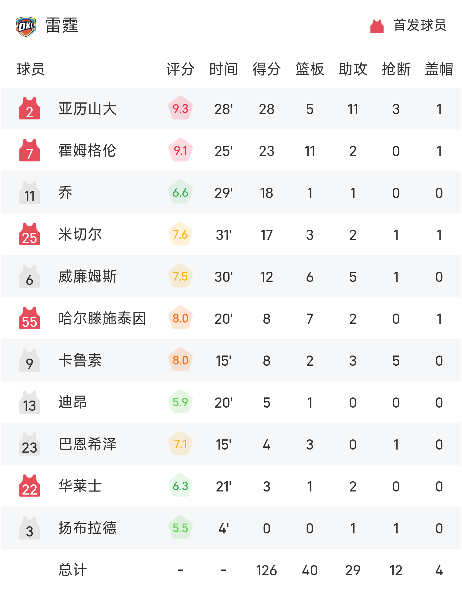 NBA战报:亚历山大28分11助,雷霆126-102大胜勇士