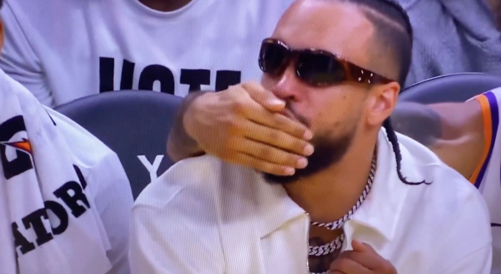 本场竞赛第四节关键时刻,太阳一度将分差缩减至个位数,但在库里罚篮时,因伤缺席的狄龙·布鲁克斯在场下对着勇士球员喋喋不休喷着垃圾话,一旁的利弗斯虽然及时用手挡住狄龙的嘴,但还是被裁判员吹罚了技术违例,而太阳最终也未能上演逆转。