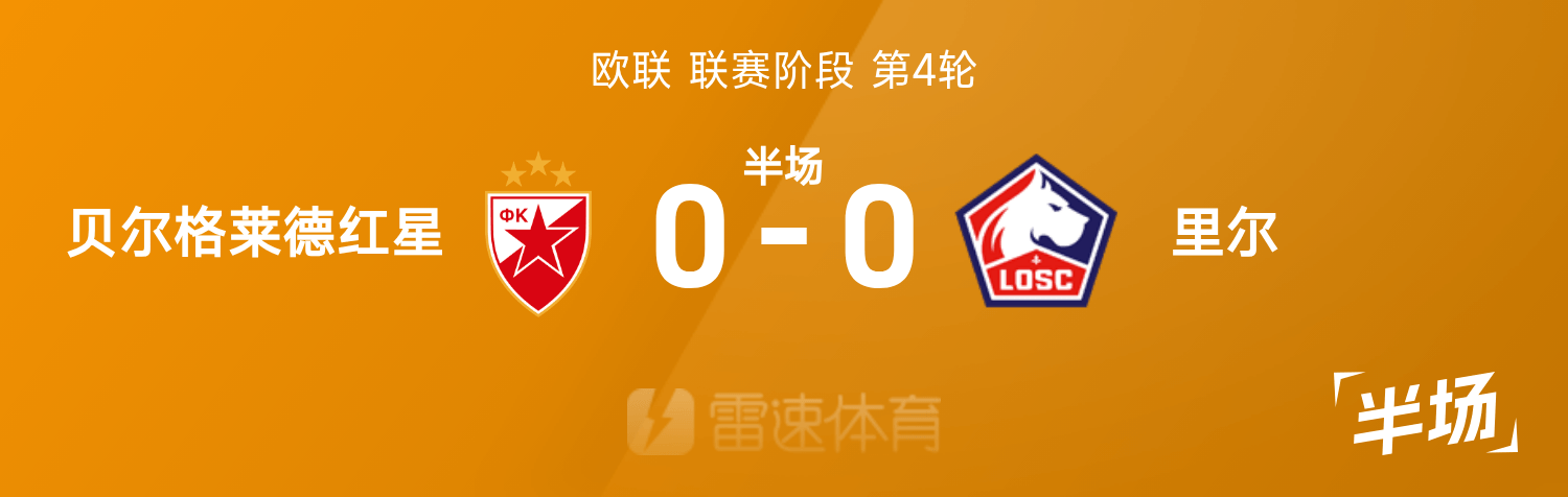 6686体育官网11月07日讯 25/26赛季欧联联赛事阶段第4轮,贝尔格莱德红星迎战里尔。半场战罢,双方赛果分暂为贝尔格莱德红星0-0里尔。