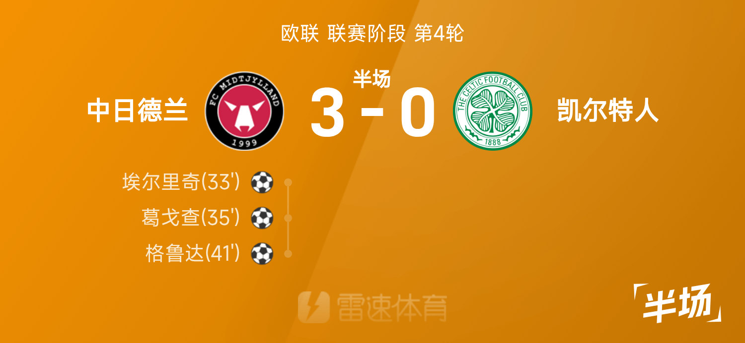 6686体育官网11月07日讯 25/26赛季欧联联赛事阶段第4轮,中日德兰迎战凯尔特人。半场战罢,双方赛果分暂为中日德兰3-0凯尔特人,葛戈查发挥出色贡献1射1传。