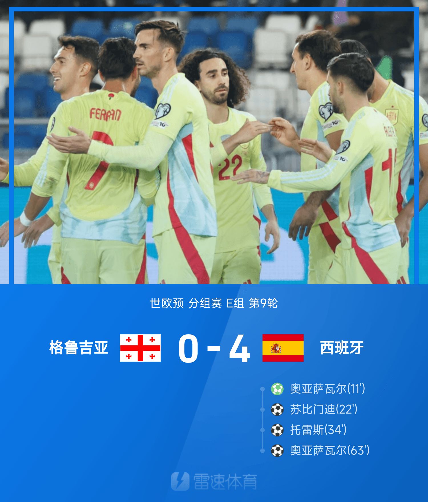 世欧预战报:奥亚萨瓦尔2射1传,西班牙4-0格鲁吉亚