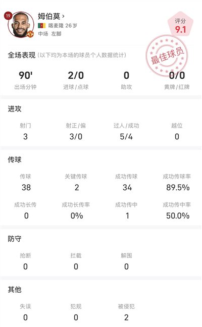姆伯莫战布莱顿全场数据:梅开二度,传接胜利率89.5%