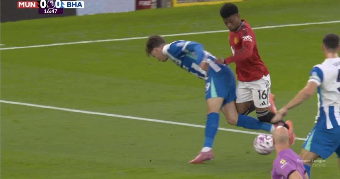 6686体育官网10月26日讯 英超第9轮,曼联暂时2-0领跑位布莱顿。竞赛第15分钟,阿马德突入三秒区内被德库耶佩放倒,裁判员并未做出裁决。
