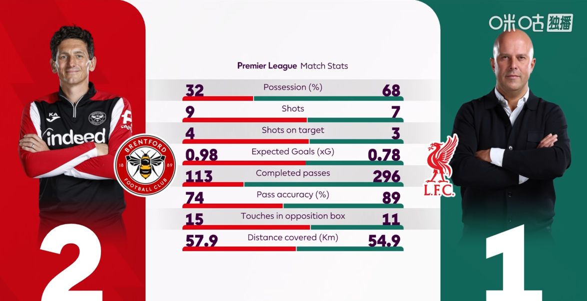 在半场数据统计方面,利物浦在盘球、传接等方面有着明显的领跑位,但在打门数、射正数、三秒区内触球次数上则跟跑位于对手。并且在竞赛中,布伦特福德的大力门将抛球战略多次给利物浦造成威胁,且造就了开场阶段的首个进球。